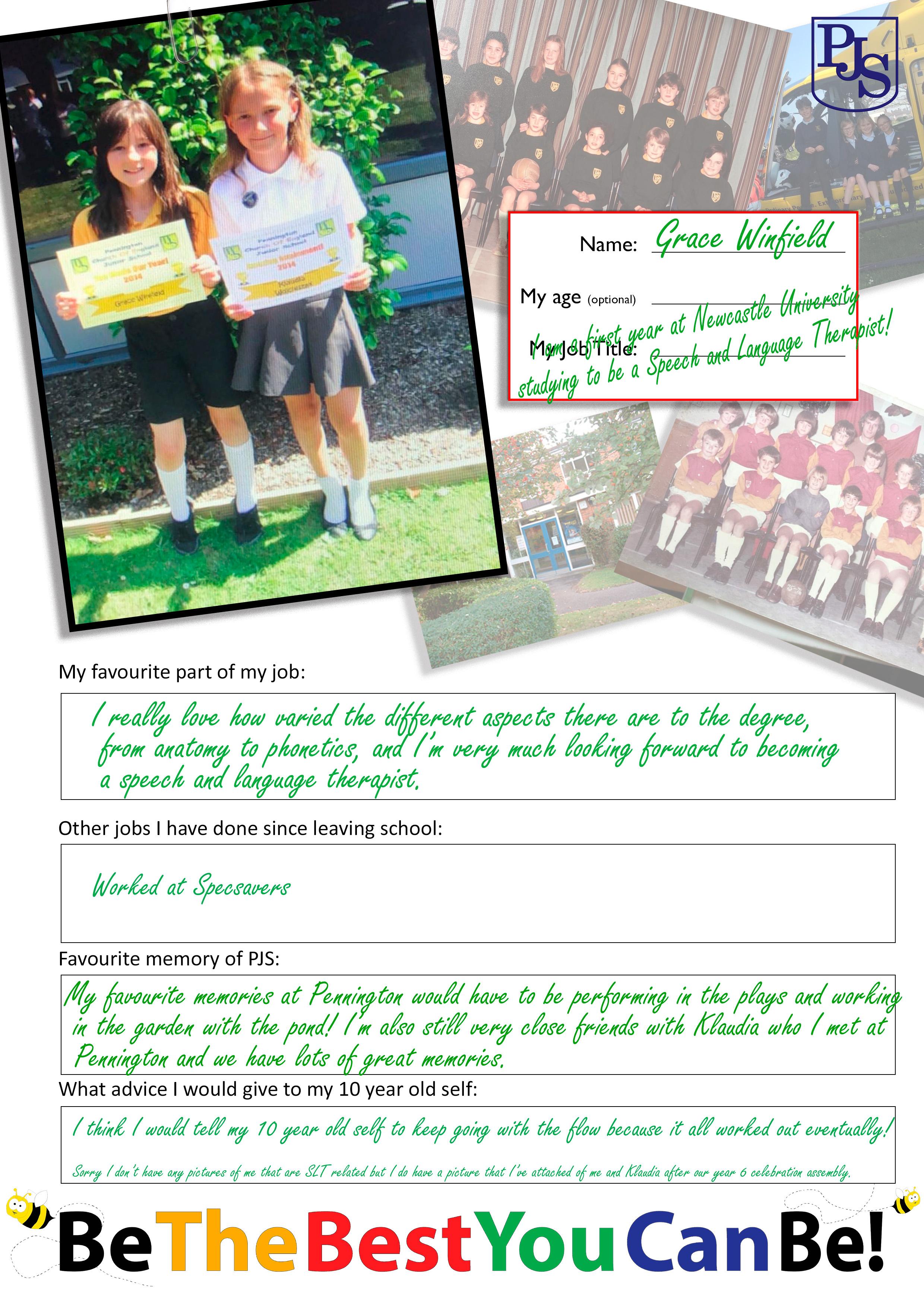 In 2023, Ms Forrest started to collect together information on past Pennington Junior School Students, so that we could share with current and future year 6 students what our ex-pupils have gone on to do since leaving PJS, in the hope that we can help to build our children's aspirations for the future, and inspired them to become the very best that they can be.
